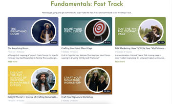 Fundamentals ier ($2000 USD/year + applicable taxes): This tier (laid out on the page below) is great for you if you already know you resonate with my approach and you want a lot of support to translate it into your business. This level is sequentially structured, includes a weekly call with me (sometimes two a week), well-designed, self-paced courses, plus a lot of other support to help you implement this instead of just understanding it. We'll explain more on that in a minute...